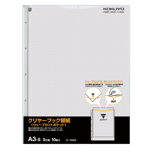 ●穴が大きく穴数が少ない連結とじ穴を採用しているので、とじ具に通しやすくなりました。●ポケット内寸/421×307mm●ポケット仕様/ウェーブカット・つや消し仕上げ・中紙あり●サイズ/425×323mm●穴数/5穴●適用商品/ラ-T733他●中紙あり●再生PP●ユニバーサルデザイン