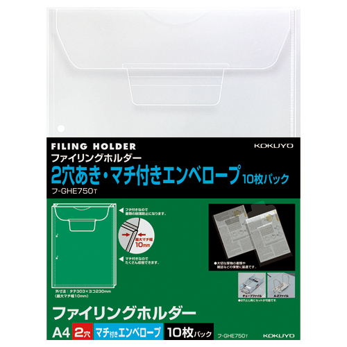 ファイリングホルダー(2穴あき) A4縦 透明 マチ付き封筒型 10枚入 フ-GHE750T