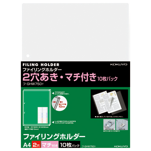 ファイリングホルダー(2穴あき) A4縦 透明 マチ付き 10枚入 フ-GHW750T