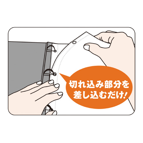●綴じ具を開かずにバインダーにリフィールを差し込める製品です●リフィールの切れ込み部分を綴じ具に差し込むだけで綴じられて、簡単に抜け落ちない構造です。外す時はリフィールを手前に持ち上げるように引っ張ると簡単に外れます●長期間使える丈夫な厚手素材を採用●A4タテ●サイズ/314×255×20mm●つや消し仕上げポケット●中紙なし●穴数/4穴(80mmピッチ)●ポケット/PP(0.18mm厚)●ポケット数/5枚●最大収容ポケット枚数/20枚●本体・ポケット/再生PP※本体のとじ具は開閉しません※替紙は専用リフィールをご使用ください
