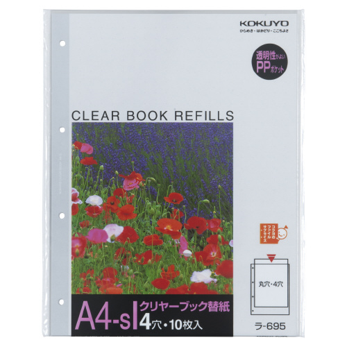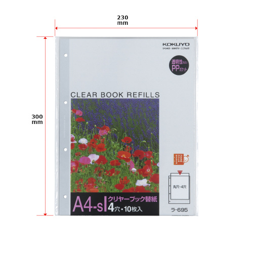 ●入り数/10枚●サイズ/300×230mm●ポケット内寸法/タテ298×ヨコ213●ポケット仕様/高透明・中紙あり●穴数/4穴●PP