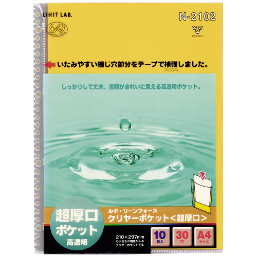 ●A4タテ ●外寸法/302×229mm ●ポケット仕様/高透明・超厚口・中紙あり ●ポケット内寸/298×212mm ●シート厚み/0.15mm ●中紙色/黄 ●材質/再生PP ●入数/10枚 *とじ穴部分のテープ補強と底部ローレット加工による耐久性の高いリーンフォースポケット ●30穴(2穴・4穴)対応