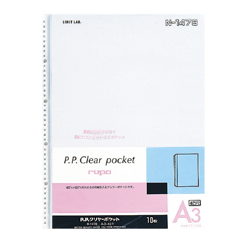 ●A3タテ ●外寸法/426×315mm ●ポケット仕様/エンボス仕上げ・中紙あり ●ポケット内寸/423×302mm ●シート厚み/0.06mm ●中紙色/グレー ●入数/10枚 ●とじ具にあたっても傷みにくいローレット加工。 ●4・42穴対応
