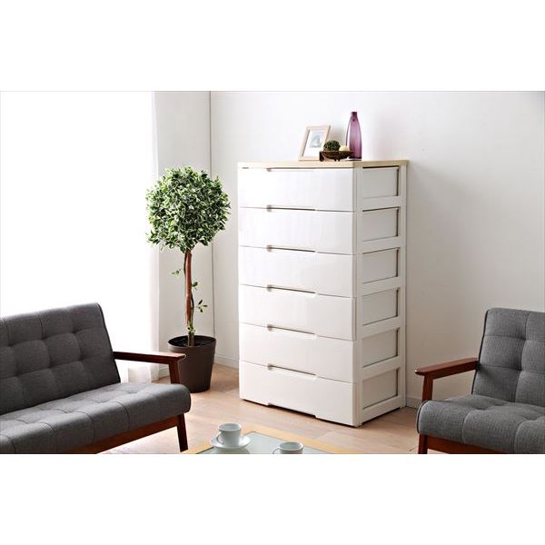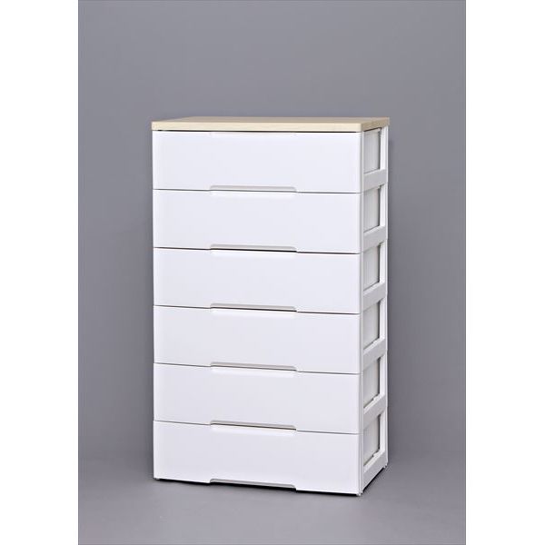 商品の説明サイズ:4)幅80cm?|?スタイル:C.6段単品?|?カラー:ホワイト/天板ナチュラルリビングの収納にピッタリの木天板付きのおしゃれなチェストです。木天板は汚れに強く、前板は塗装家具のような質感でデザイン性にも優れています。また、引出しには開閉がスムーズな金属レールを採用しました。引出しは厚手のセーター等が2枚ゆったり収納できるサイズです。※完成品でお届けします。※上段を下段に重ねる作業のみ必要です。