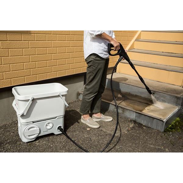 商品の説明近くに水道(蛇口)がなくても使える、高圧洗浄機です。ガンコな汚れを高圧水流で吹き飛ばして掃除できます。洗車や玄関周り、ベランダなどの掃除に適しています。