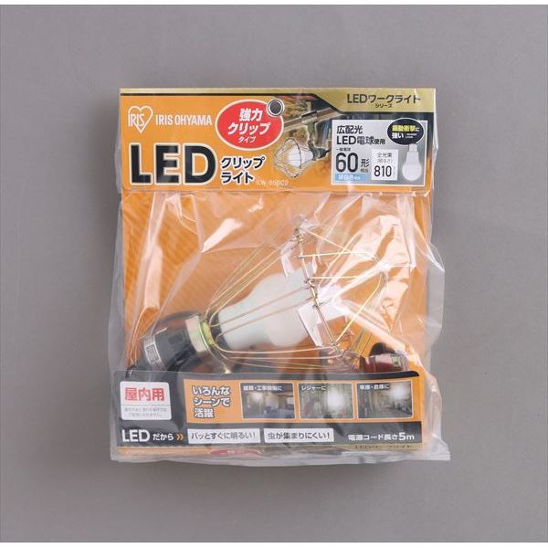 商品の説明スタイル:810lmLED電球を採用した屋内用クリップライトです。消費電力が白熱電球比で約1/9と少なく、省エネで長寿命(約40000時間)です。強力クリップでどんな場所でも挟んで使え、取り付け角度も自在に調節できます。LED電球は、白熱球に比べて振動や衝撃に強い構造です。高い耐久性が求められる作業現場などのシーンに最適! 連結ソケット付きなので、電源1つで複数連結が可能です。