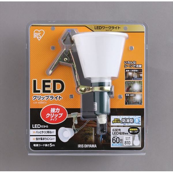商品の説明スタイル:810ルーメンLED電球を採用した作業用クリップライト。屋外でも使える防滴型(IP32)です。消費電力が白熱電球比で約1/9と少なく、省エネで長寿命(約40000時間)! ライトをしっかり支えるクリップがついているので、ポールや板などを挟んで使えます。ライトの角度は、自在に調節できます。LED電球は、白熱球に比べて振動や衝撃に強く、高い耐久性が求められる作業現場などのシーンに適しています。