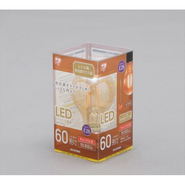 【仕様】●メーカー:アイリスオーヤマ ●型番:LDA7CGFK ●商品名:LED電球 ●屋内用 ●フィラメント電球タイプ ●明るさ:60W形相当 ●電源:100V 50/60Hz ●光色:キャンドル色 ●配光角度(°):290 ●定格消費電力(W):7.0 ●定格入力電流(A):0.111 ●全光束(lm):810 ●設計寿命(h):20000 ●サイズ(mm):φ60×106 ●質量(g):約31 ●口金:E26 ●密閉形器具対応 ●材質:ガラス ●カバー:琥珀調