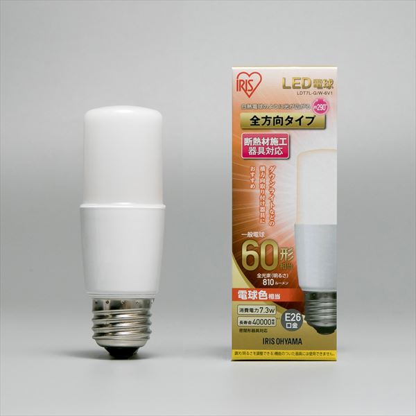 商品の説明色:1)電球色?|?サイズ:1)単品?|?スタイル:3)スリムタイプ(T型)白熱電球のように光が広がる、全方向タイプのLED電球です。ダウンライトなどの横方向取り付け器具に最適です。口金サイズがE26口金なので、照明器具を替えることなくご使用いただけます。断熱材施工器具・密閉形器具にご使用可能です。(※断熱材施工器具や密閉形器具の種類によって保護回路が働き電力を抑えるため、明るさが低下する場合があります。そのほか器具の形状や寸法、熱がこもる等の要因により、使用できなかったり、寿命が短くなる場合があります。)長寿命約40000時間。ランプ交換の手間が省けます。光色はバランスが取れた明るさで過ごしやすい空間を演出する「昼白色相当」と、温かみのある「電球色相当」の2種類です。★LED電球の特長★・水銀レス:環境に有害な水銀を含みません。・すぐに明るく:スイッチを入れた瞬間に明るく点灯します。・虫が集まりにくい:虫が集まりやすい紫外線領域波長をほとんど出さず、灯具清掃の手間を軽減できます。・ON/OFFに強い:スイッチを頻繁にON/OFFしても劣化せず、寿命が短くなりません。・低UV/低赤外線:紫外線や赤外線をほとんど出さないので、紫外線による色あせや赤外線による熱が気になりません。