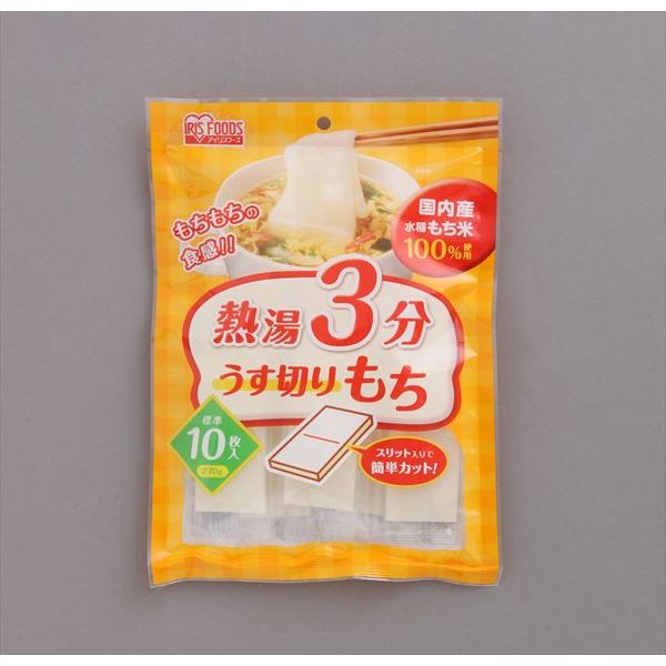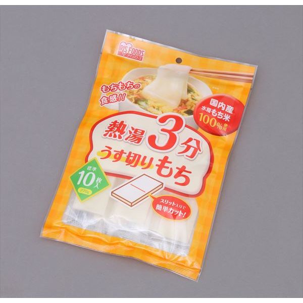 商品の説明調理メニューが広がるうす切りもち。1.厚さ7mmで、食べやすい大きさに手でカットできます。2.カット後は4cm×4.3cmのひと口サイズです。3.熱湯3分で食べられます。