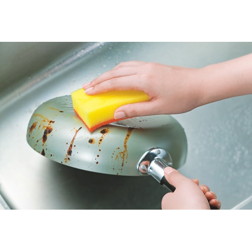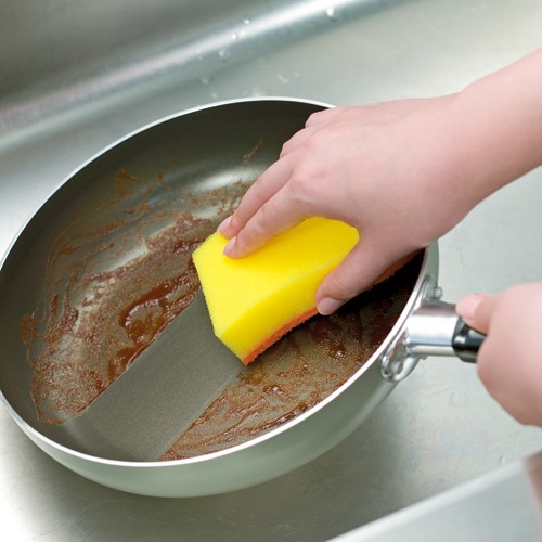 ●フッ素加工品、ガラス製品などもキズをつけにくく、こびりつきや、コゲ、茶しぶまでしっかり落とす