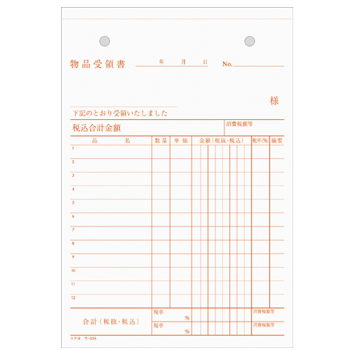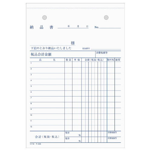 NC複写簿 4枚納品書 請求書受領書付 B6縦 2穴80mmピッチ 7行 50組 ウ-335