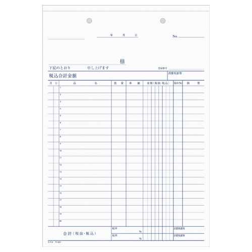 NC複写簿 仕切書 B5縦 2穴80mmピッチ20行 40組 ウ-301