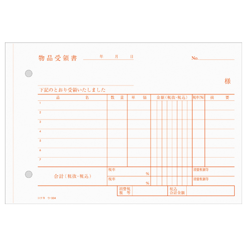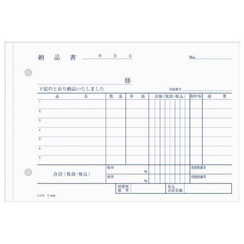 NC複写簿4枚納品書(請求書受領書付) B6横 2穴80mmピッチ 7行 50組 ウ-334
