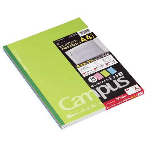 キャンパスノートカラー表紙ドット入り A4罫幅7mm35行30枚 アソート3冊 ノ-203CATX3