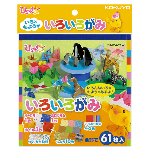 ●サイズ/150×150mm ●楽しい柄入りの、ブックタイプの折り紙 ●バラエティ豊富な61枚入り。オーロラやホログラムなど子供に人気のキラキラ・ピカピカの折り紙や動物柄などが印刷された模様の折り紙です ●セット内容/いろおりがみ46枚、オーロラ1枚、ホログラム1枚、ホイル3枚、模様10枚 ●つくりかた6種 ●ばらけにくく、1枚ずつきれいにはがせるブックタイプ