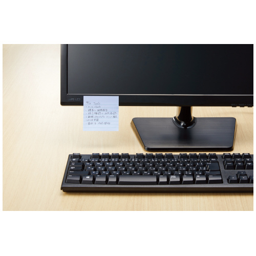 ●パソコンや電話、キャビネットなどの樹脂面や垂直面などつきにくかった場所にもしっかり貼れるのに、キレイにはがせる。(メーカー通常粘着製品比)