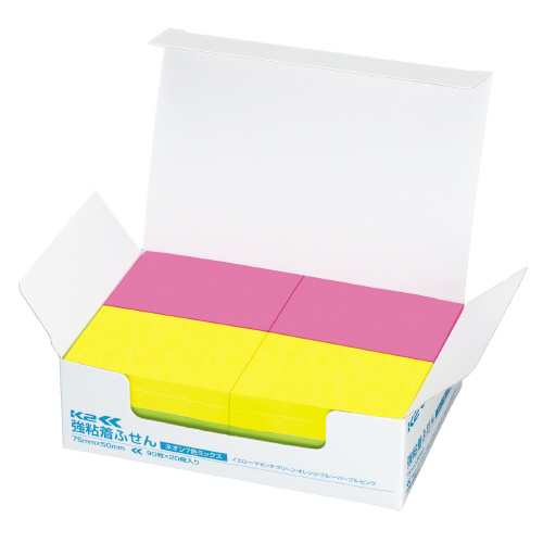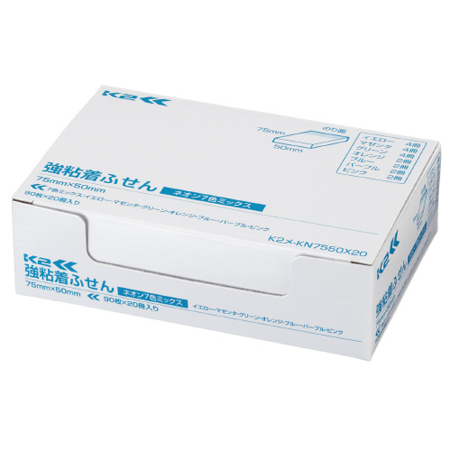 強粘着ふせんK2 75×50 20冊 ノートタイプタテ(ネオン7色ミックス) K2メ-KN7550X20