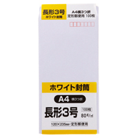 ●長形3号 ●サイズ/120×235mm ●紙厚80g/平方メートル ●100枚入り ●〒枠付 ●センター貼り ●紙質/白封筒用紙(ケント)