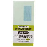 ●中身が透けない裏地紋入り窓付き封筒 ●窓部は分別せずに処分できる環境対応のグラシン紙を使用 ●長形3号 ●サイズ/120×235mm ●グリーン ●紙厚80g/平方メートル ●100枚入り ●マド寸法/45×90mm ●センター貼り ●古紙配合紙 ●窓/グラシン紙