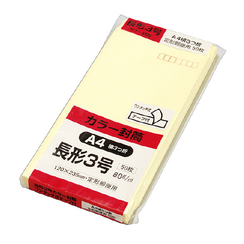 ●長形3号 ●サイズ/120×235mm ●クリーム ●紙厚80g/平方メートル ●50枚入り ●テープ付 ●〒枠付 ●サイド貼り ●古紙配合紙