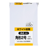 ●角形2号 ●サイズ/240×332mm ●紙厚100g/平方メートル ●100枚入り ●テープ付 ●〒枠無 ●センター貼り ●紙質/白封筒用紙(ケント)