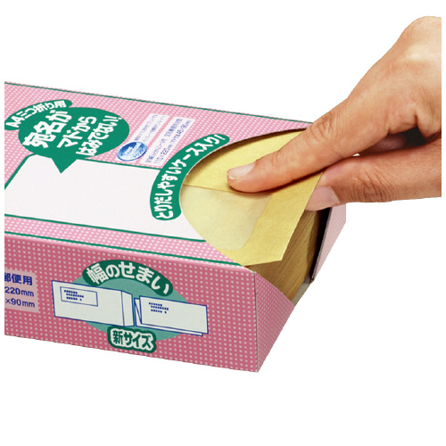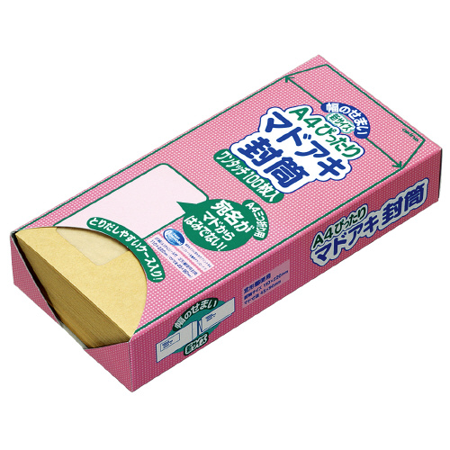 ●取り出しやすいケース入り ●A4三つ折りぴったりサイズ ●長形6号 ●サイズ/110×220mm ●クラフト ●紙厚70g/平方メートル ●100枚入り ●ワンタッチのり付き ●マド寸法/45×90mm ●サイド貼り ●古紙配合紙 ●窓/グラシン紙