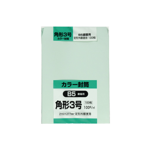 ●角形3号 ●サイズ/216×277mm ●グリーン ●紙厚100g/平方メートル ●100枚入り ●〒枠無 ●サイド貼り ●古紙配合紙