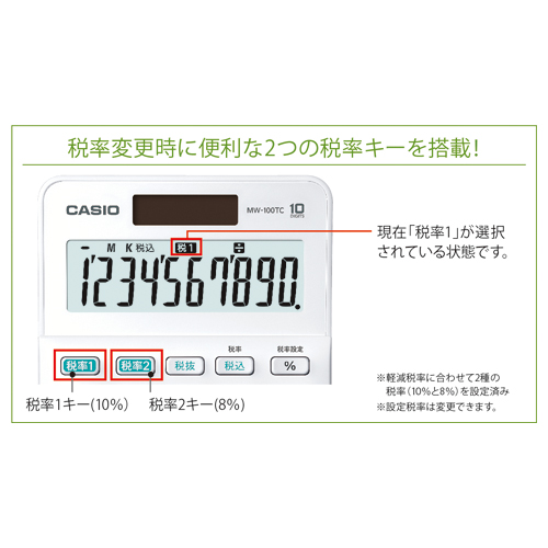 ●2つの税率計算ができる●12桁●傾斜表示●プラスチックキー●税計算×2●サイズ/W108×D181.5×H23mm●質量/約145g(電池含む)●電源/太陽電池+CR2032×1●早打ち対応●すべり止め付き●保証期間/1年