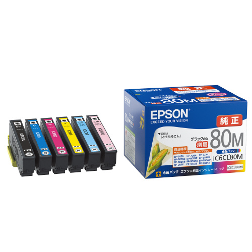 ●6色パック(ブラックのみ増量サイズ):ブラック(増量)(型番:ICBK80L)・シアン(型番:ICC80)・マゼンタ(型番:ICM80)・イエロー(型番:ICY80)・ライトシアン(型番:ICLC80)・ライトマゼンタ(型番:ICLM80)