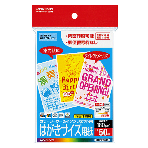 カラーLBP&IJP用はがき紙 はがきサイズ 郵便番号枠無し 50枚/袋