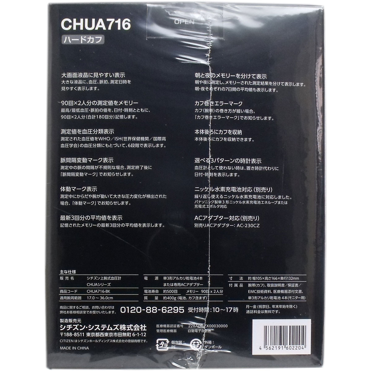 【仕様】・測定方式・・・オシロメトリック法・測定部位・・・左腕(右上腕も可)・カフ(適用腕周範囲)・・・ハードカフ(範囲:17.0~36.0cm)・表示方式・・・デジタル表示・測定範囲・・・圧力:0~280mmHg、目量:1mmHg、脈拍:40~180拍/分・測定精度・・・圧力:±3mmHg、脈拍:読み取り数値の±5%・加圧・・・ポンプによる自動加圧・減圧・・・電子制御弁による速度制御減圧・排気・・・電子制御弁による急速排気・定格及び電源・・・DC6V、単3形乾電池4本または専用ACアダプター(AC-230CZ)または単3形ニッケル水素充電池(エネループまたは充電式エボルタ)4本・電池寿命・・・アルカリ乾電池:約500回/マンガン乾電池:約150回※モニター用電池をのぞく(1日1回測定、室温22度、170mmHg加圧で測定の場合)・メモリー・・・90回×2人分・質量・・・本体:約400g(電池含まず)、カフ:約150g・寸法・・・105(幅)×166(高さ)×132(奥行)mm・使用環境温湿度・・・10~40度、相対湿度30~85%RH・保管環境温湿度・・・-20~60度、相対湿度10~95%RH・付属品・・・腕帯(カフ)、単3形アルカリ乾電池4本(モニター用)、取扱説明書/保証書/EMC技術資料、医療機器添付文書