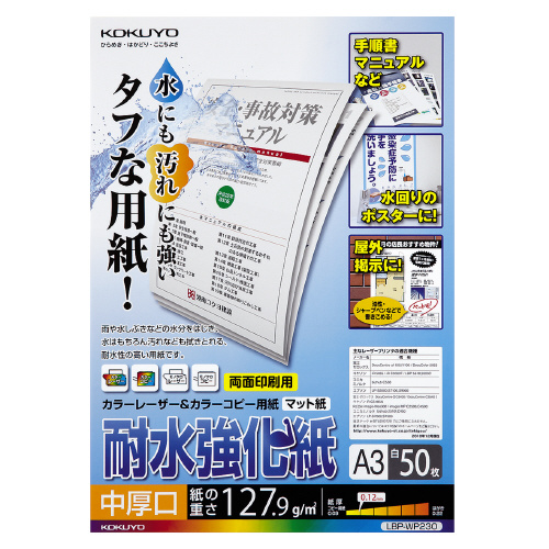 ●耐水性に優れ、汚れにも強く、丈夫で破れにくいタフなカラーレーザー・カラーコピー用の耐水強化紙です。