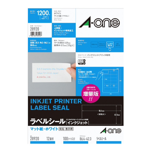 インクジェット用ラベルシール マット紙 12面四辺余白付 100枚