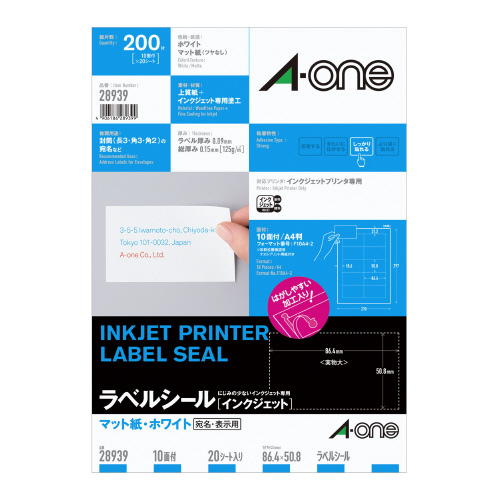 インクジェット用ラベルシール マット紙 10面 四辺余白付 20枚