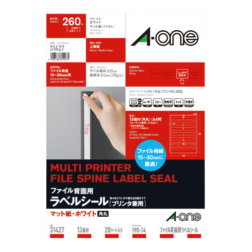エーワンプリンタ兼用ラベル マット紙 ファイル背面用ラベルシール13面20枚