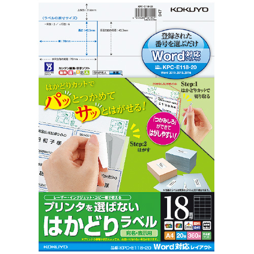 プリンタを選ばないはかどりラベル ワード対応 A4 18面 20枚入