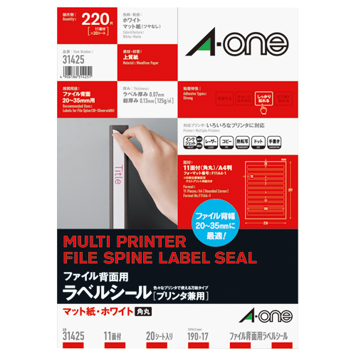 エーワンプリンタ兼用ラベル マット紙 ファイル背面用ラベルシール11面20枚
