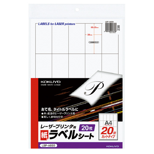モノクロレーザープリンタ用紙ラベル A4 20枚入 20面カット