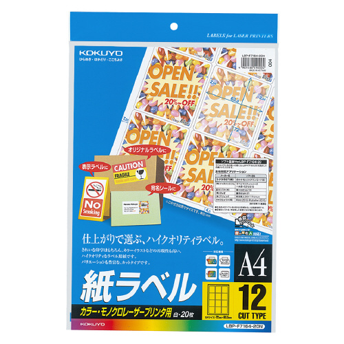 LBP用紙ラベル カラー&モノクロ対応 A4 20枚入 12面カット LBP-F7164-20N